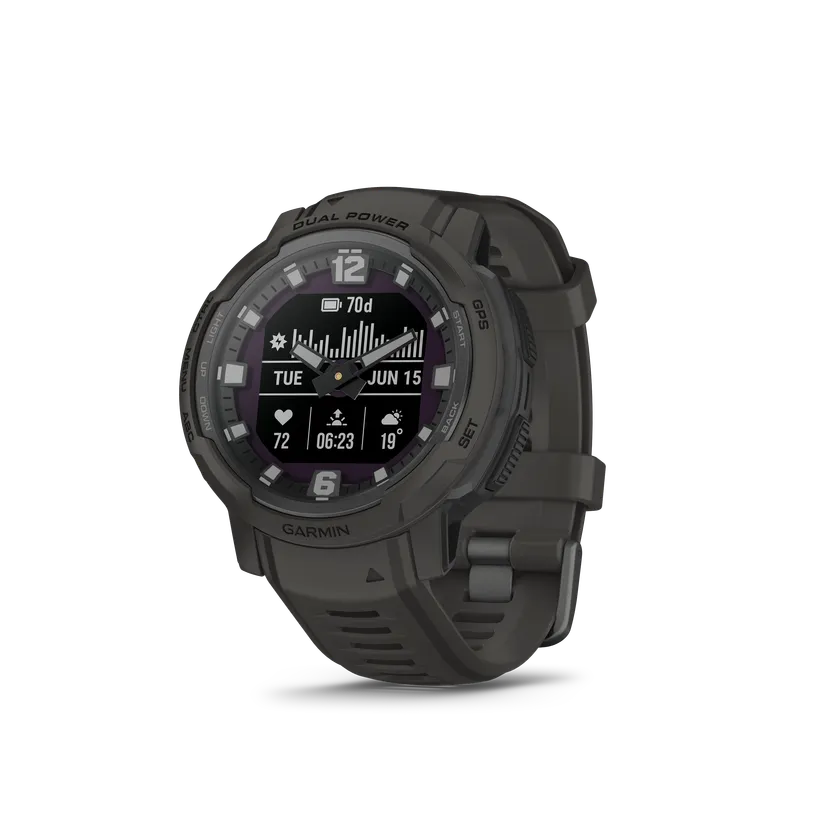 Garminが誇るバッテリー性能はさらに強化され、独自のパネル層とIC効率化により、驚きのロングバッテリーを実現。ソーラーバッテリーを搭載した『Instinct Crossover Dual Power』は、アナログモードでは無制限。もっとも電力を要するGPS+光学心拍計モードでも約25時間に加えソーラー充電プラス6時間と、驚きの長時間稼働を提供します。