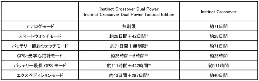 ラインアップはソーラーバッテリー搭載の『Instinct Crossover Dual Power』(2種)、暗視ゴーグルとの互換性やステルスモードなどのミリタリー機能を備えた『Instinct Crossover Dual Power Tactical Edition』、オンラインショップ限定販売のノンソーラーモデル『Instinct Crossover』の全4モデルを展開します。
