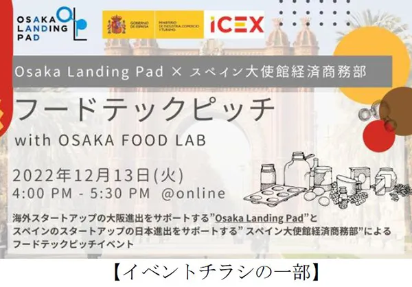 この度、阪急阪神不動産株式会社(本社: 大阪市北区、社長:諸冨隆一(※1))は、オンラインイベント「Osaka Landing Pad × スペイン大使館 経済商務部“フードテックピッチイベント with OSAKA FOOD LAB”」を2022年12月13日(火)に開催いたします。