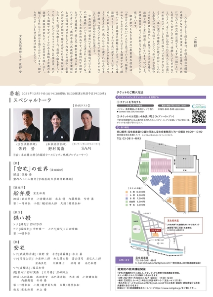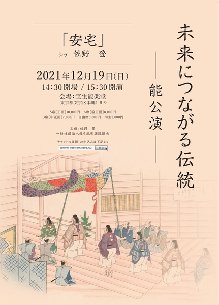 一般社団法人日本能楽謡隊協会『未来につながる伝統 -能公演 -』が2021年12月19日(日) に宝生能楽堂(東京都文京区)にて上演されます。チケットはカンフェティ(運営:ロングランプランニング株式会社、東京都新宿区、代表取締役:榑松 ⼤剛)にて発売中です。