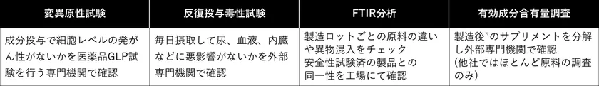 当社はサプリメント業界への新規参入にあたり、既存商品を利用することを当初は検討していましたが、こういった実態を知り、製品を独自設計した上で製造し、実施し得る全ての安全性試験を実施した上で販売するプロジェクトとしました。
