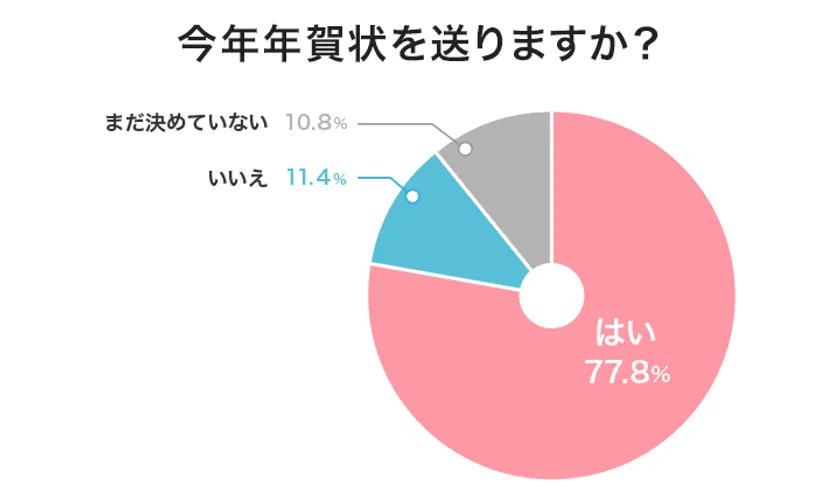 「昨年送った」より10%減りはしますが、「まだ決めていない」の10.8%をいれると昨年送った方87.8%とほぼ同率になります。昨年まで年賀状を交換されていた方からは、今年も年賀状が届く可能性があります。もらってから慌てないように、年内に年賀状の用意をしておくのも良いかもしれません。