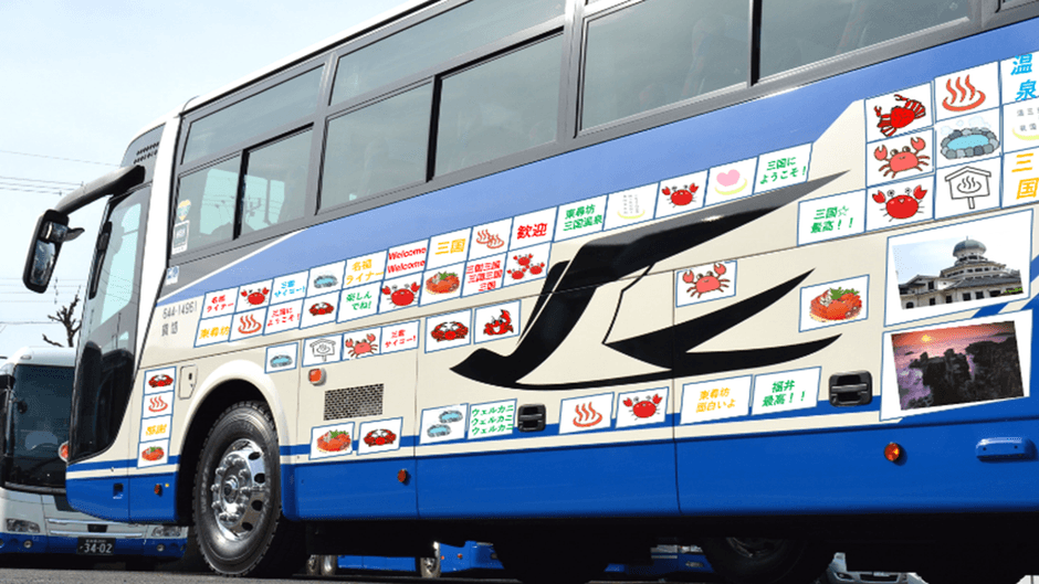 福井県坂井市立三国北小学校の¨全校生徒¨が描いた絵やメッセージ、及び「第15回こどもが描くふるさと坂井絵画展」の入賞作品をシールにしてバス車体にラッピングし、期間中運行します。