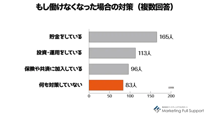 もし働けなくなった場合の対策としては、1位が「貯金」で53.1%、2位が「投資・運用」で36.3%、3位が「保険や共済」で30.9%だった。その一方で4位「なにもしていない」も26.7%でした。(複数回答)