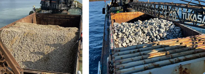 東亜建設工業では、埋立地の造成や防波堤の築造など、さまざまな港湾工事を行っていて、工事で使われる石材などはガット船で運搬されます。運搬後の検収業務として、船上で石材などの体積計測が行われます。