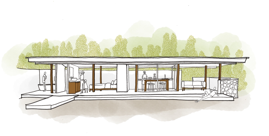 沖縄モダン建築であるコンクリート造平屋建て。バーベキューテラスのあるお部屋です。公民館や、伝統的な糸紡ぎや機織りの見学ができる芭蕉布会館がすぐそばにある集落の中心地にあります。