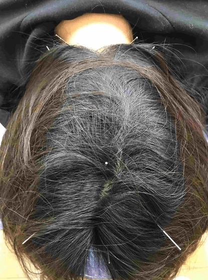 頭のストレスと自律神経を整える頭部のツボに鍼をさしています。