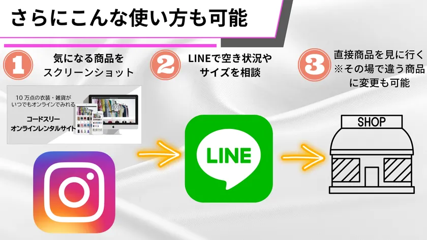 LINEでは『この商品がきになる』・『こんなイメージのアイテムが借りたり』など、画像を送っていただければ、スタッフが即日対応いたします。