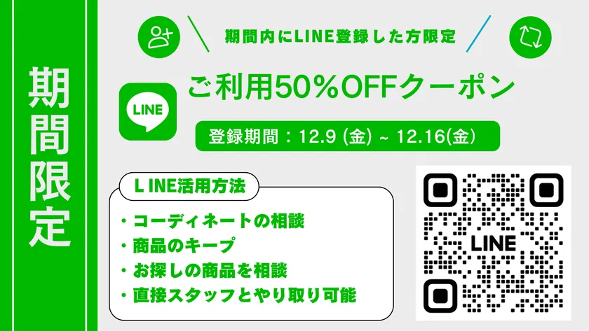 この度、2022年12月9日(金)~12月16日(金)までに公式LINEをご登録いただいた方に、期間限定で『ご利用50%OFFクーポン』を配布いたします。