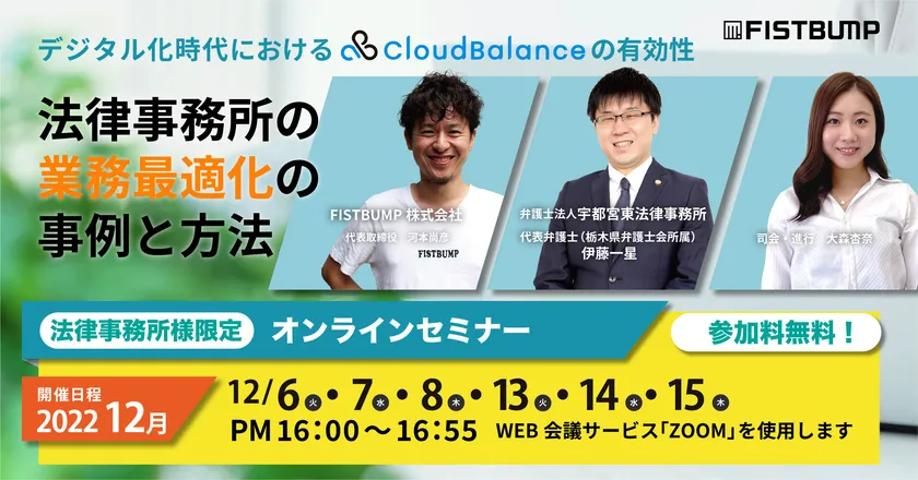 株式会社FISTBUMP(本社所在地:香川県高松市、代表取締役:河本 尚彦)は、「それぞれの所内にあったデジタル化」の進め方に特化した“小さな一歩から徐々に始める「法律事務所のデジタルシフト」”に関してお伝えする12月度のセミナーを開催します。