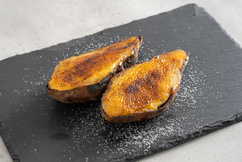 当店のおいも蜜たっぷりの熱々な焼き芋に、自家製のカスタードクリームを乗せ、目の前でバーナーで炙り、キャラメリゼしてからご提供する、できたてのお芋ブリュレです。焼き芋をまるごと使用し、パリッとブリュレ部分と焼き芋を一緒に食べることで、満足感たっぷりです。