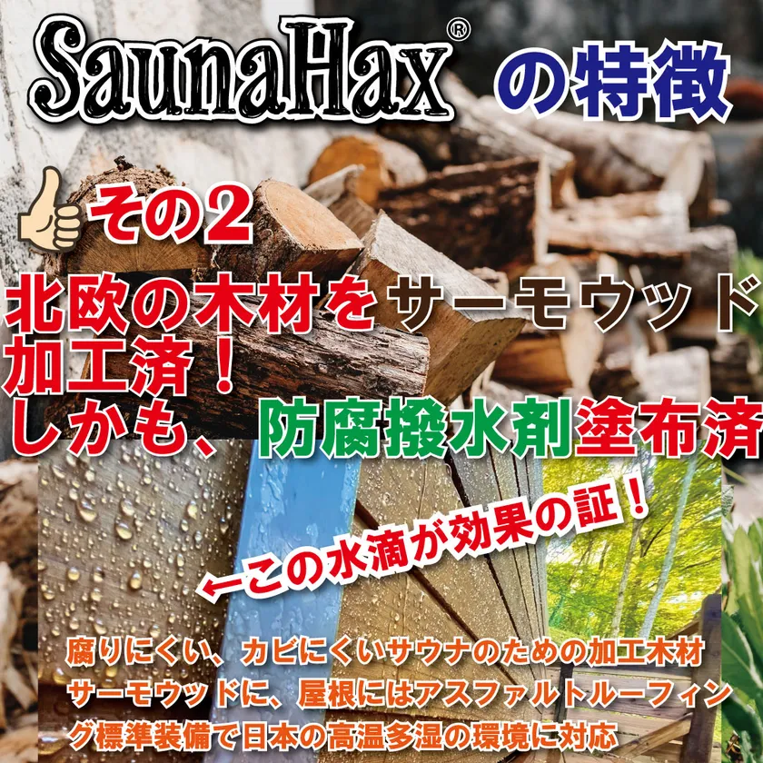 2. サウナ用の加工木材、「サーモウッド」を贅沢に使用。更に、日本の高温多湿な気候に合わせて防腐撥水剤塗布済での施工
