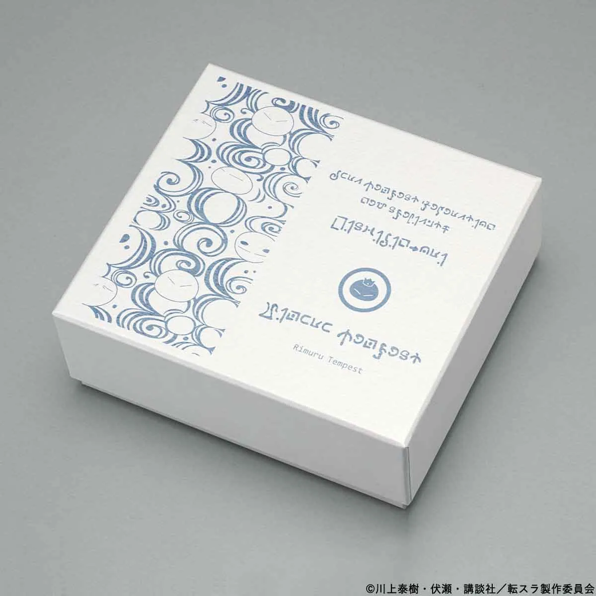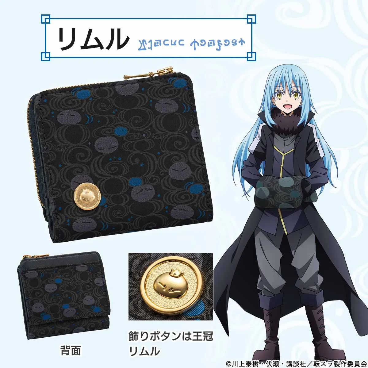 天面にそれぞれの財布の柄、飾りボタンとおそろいのリムルのイラスト、転スラ世界の文字“転生文字”が描かれた特製ボックスに収めてお届けします。