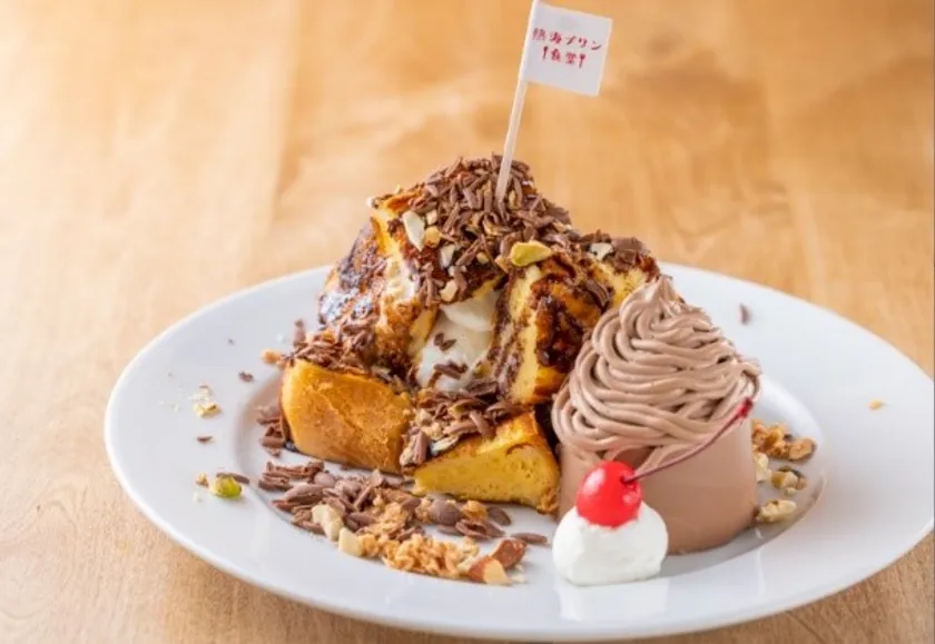 熱海プリン食堂自慢のプルンプルンのフレンチトーストに、チョコソースとナッツをちらし、横にはチョコモンブランクリームをのせたチョコプリンを添えました。今年から新登場のチョコスイーツです。