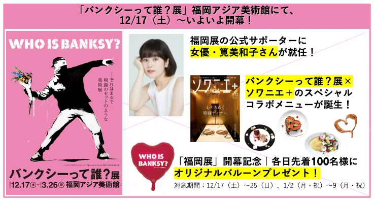 本展覧会は、ただ絵をみるだけではない、バンクシーの作品が実際のスケール感で描かれた世界の街並みを歩きながらご体感いただける新感覚の没入型展覧会となっており、全国4都市で42万人を導入した展覧会です。福岡展では、公式サポーターに女優の筧美和子さんが就任した他、バンクシーの世界観をご自宅にお持ち帰りいただける福岡展限定のプレゼントや、グルメマガジン「ソワニエ+」とのスペシャルコラボメニューが誕生するなど、「バンクシーって誰?展」最終開催地となる福岡展を盛り上げる企画も盛り沢山。ここでしか体感することができない素敵な展示をお楽しみください。