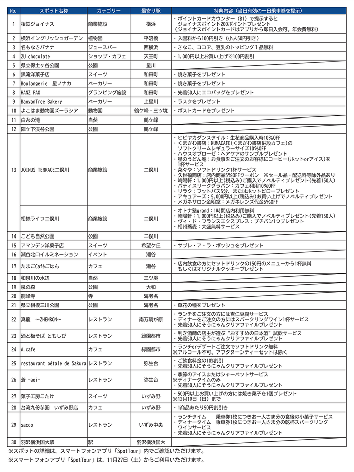 同キャンペーン期間中、当日有効の1日乗車券を「相鉄沿線名店プロジェクト」をはじめとした沿線の飲食店や「ジョイナステラス二俣川」、「相鉄ライフ二俣川」などの対象店舗や施設でご提示いただくと、プレゼントや特典を受けられるほか、相鉄ジョイナスではジョイナスポイント(200ポイント)を付与します。