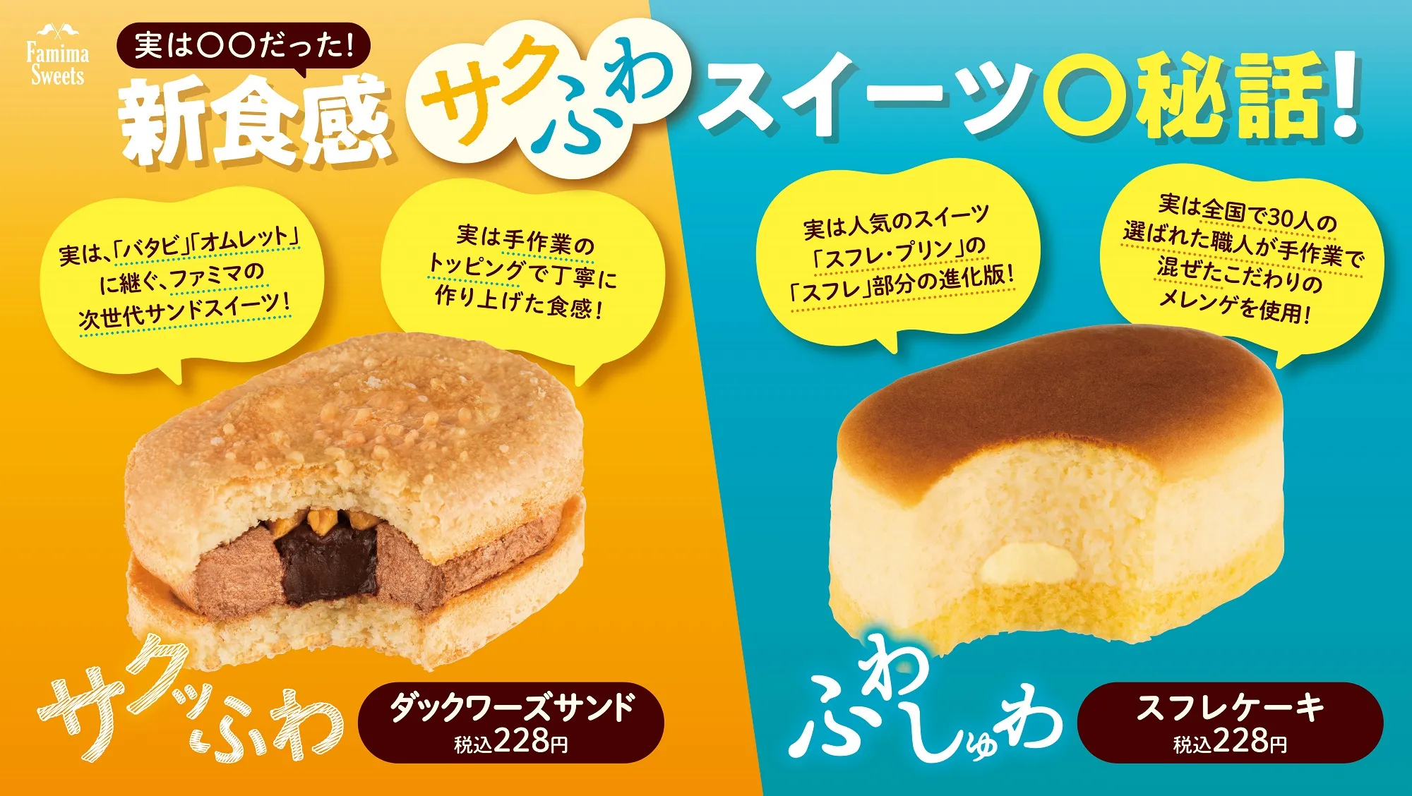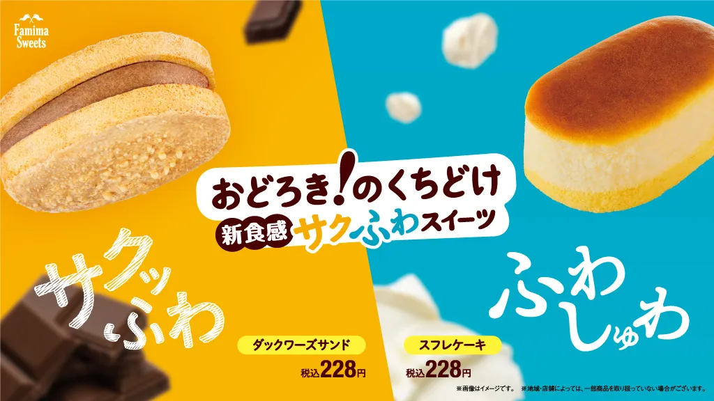 今までのファミマスイーツにはない、“サクッふわ“食感を実現した「ダックワーズサンド チョコ」と、ファミマの看板スイーツ「スフレ・プリン」のスフレをおいしく進化させた”ふわしゅわ“食感の「スフレケーキ チーズ」を是非ご賞味ください。