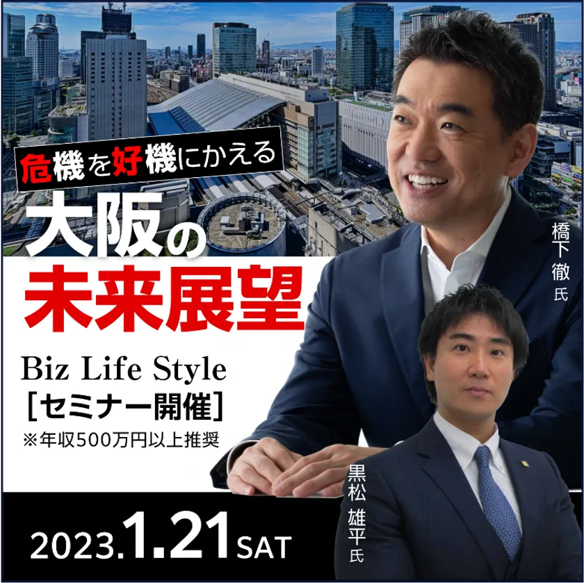 ビジネスパーソンのためのライフスタイル情報誌「Biz Life Style」(株式会社デイリー・インフォメーション関西)は、元大阪府知事で元大阪市長の橋下徹氏を迎え、「危機を好機に変える 大阪の未来展望」セミナーを、大阪で2023年1月21日(土)に開催します。