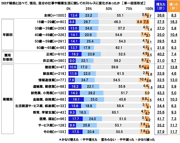 ◆「コロナ禍前と比べて、仕事や職業生活に関してのストレスが増えた」は36.6%、正規雇用者では40.2%