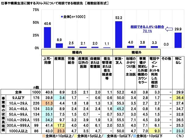 職場内の相談先で最も多いのは「上司・同僚」、職場外の相談先では「家族・友人」