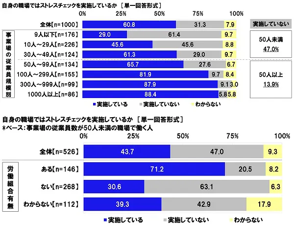 義務化されていない50人未満の事業場では、ストレスチェックを実施している割合は43.7%でした。労働組合がある職場では71.2%と、労働組合がない職場(30.6%)と比べて40.6ポイント高くなりました。