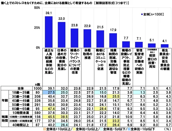 最後に、全回答者(1,000名)に、働く上でのストレスをなくすために、企業における施策として希望するものを聞いたところ、「適正な人員配置・組織体制などの見直し」(39.1%)が最も高くなりました。次いで、「仕事の進め方の改善、業務配分の見直し」(32.0%)でした。
