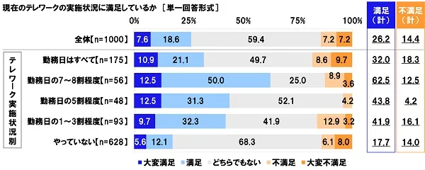 現在のテレワークの実施状況に満足しているか聞いたところ、『満足(計)』は26.2%、『不満足(計)』は14.4%となりました。