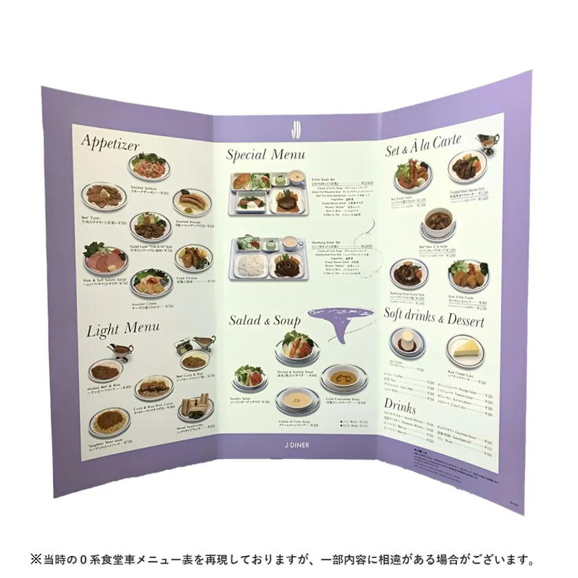 東海道新幹線の0系食堂車で使用されていたメニュー表を再現したJRCPオンラインショップ限定のアイテムです。「0系食堂車メニュー表」と「復刻 新幹線 懐かしのビーフカレー」のセットにて販売いたします。「0系食堂車メニュー表」には、当時提供されていたお料理のカラー写真