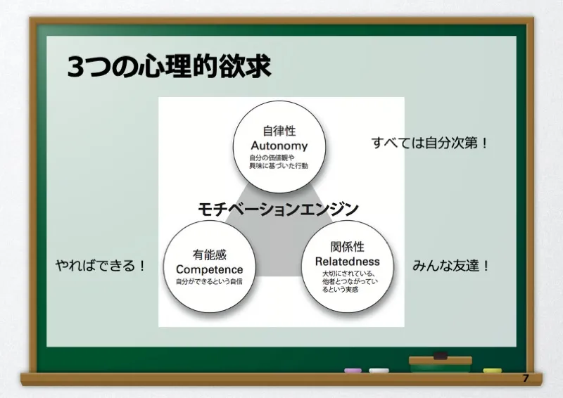 2、「英語を学びたい」(内発的動機づけ)を育てるためには、「自律性」、「有能感」、「関係性」という三つの心理的欲求をバランス良く満たすことが大切。