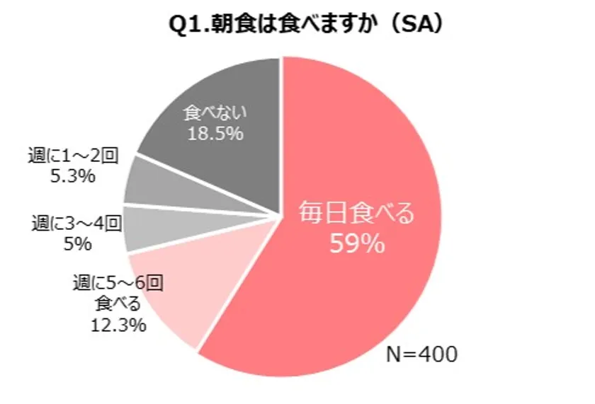 1日のサイクルを整えるために必要な朝食ですが、全員がしっかり食べているわけではありません。カルビー株式会社は朝食摂取の実態について、400名を対象に調査を行いました。朝食を食べていますかという質問に対して、毎日食べると回答した人が、全体の59%でした(下記グラフ参照)。また、朝食を食べる理由として、「朝、お腹がすいているから」(58.6%)「活発な活動を送るため」(50.9%)などが上位に上がり、1日のスタートに活力を求めていることがわかりました。