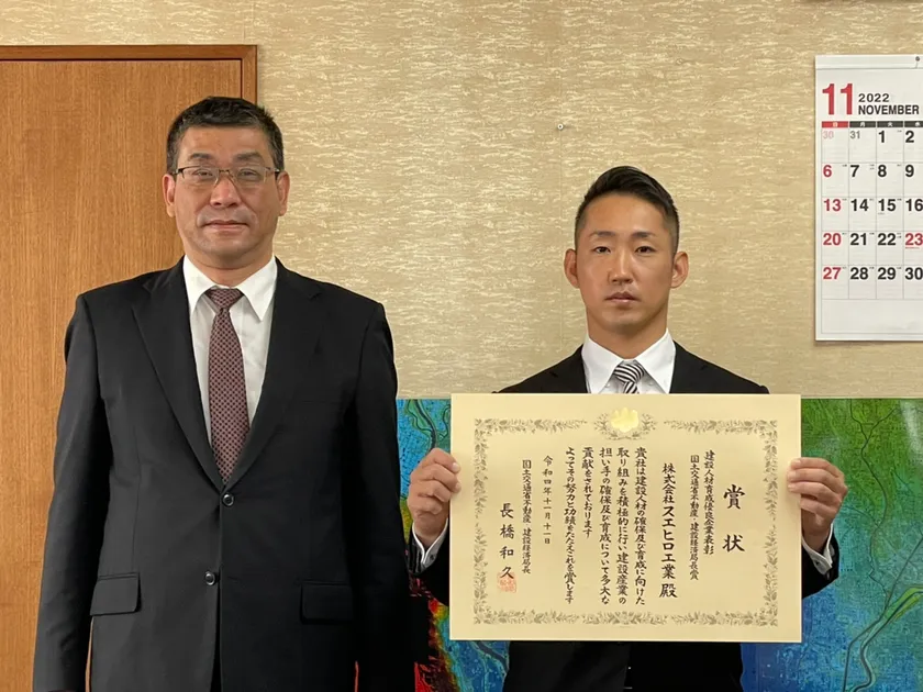 株式会社スエヒロ工業(本社:静岡県沼津市)は、国土交通省が今年度新たに創設した建設人材育成優良企業表彰で、第一回不動産・建設経済局長賞を受賞しました。