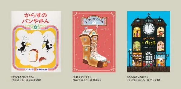 様々な絵本作家による作品が一堂に会する「ようこそ!絵本のまちへ」展。「だるまちゃん」シリーズ、『どろぼうがっこう』など、数々のロングセラー絵本を生み出してきた絵本作家かこさとしによる『からすのパンやさん』や、成長したからすの一家の子どもたちが主人公の物語のほか、イラストレーターとしても活躍するおおでゆかこによる『シロクマくつや』や、海外での受賞歴もあるたけうちちひろの『みんなのいちにち』など、何世代にも渡って親しまれている作家から若手まで、多彩な絵本作家による展示が北海道で楽しめる貴重な機会となります。