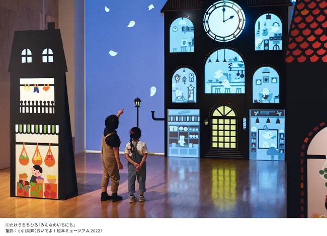 この「ようこそ!絵本のまちへ展」は、「絵と言葉のライブラリー ミッカ」をはじめ、公共施設のプロデュース、運営を手掛ける「株式会社トレック」が主催。ロングセラー絵本『からすのパンやさん』(作:かこさとし/偕成社刊)や、からすのパンやさんの成長した子どもたちが主人公となった続きのお話シリーズ、『シロクマくつや(作:おおでゆかこ/偕成社刊)』や『みんなのいちにち(作:たけうちちひろ/アリス館刊)』など、人気の絵本の世界が一堂に会し、大人も子どもも絵本の世界を楽しめる展示となっています。