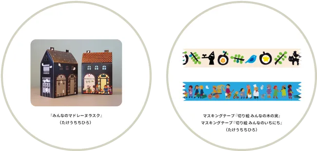 今回の展示に合わせ、ショップではオリジナルグッズも販売。絵本『みんなのいちにち』マスキングテープや、オリジナルボックスの焼菓子など、「ようこそ!絵本のまちへ展」ならではのグッズも。各作家の絵本やグッズも取り揃え、会場だけでなくご自宅でも絵本の世界をお楽しみいただけます。