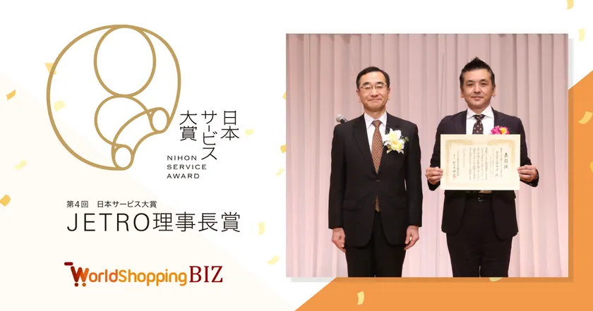 2022年12月6日に行われた「第4回 日本サービス大賞」において、株式会社ジグザグが運営する「WorldShopping BIZ」は、越境ECを始める際に必要なスキームをシンプルかつ包括的サポートしている点、グローバル化の促進に大きく貢献している点を評価いただき「JETRO理事長賞」を受賞いたしました。