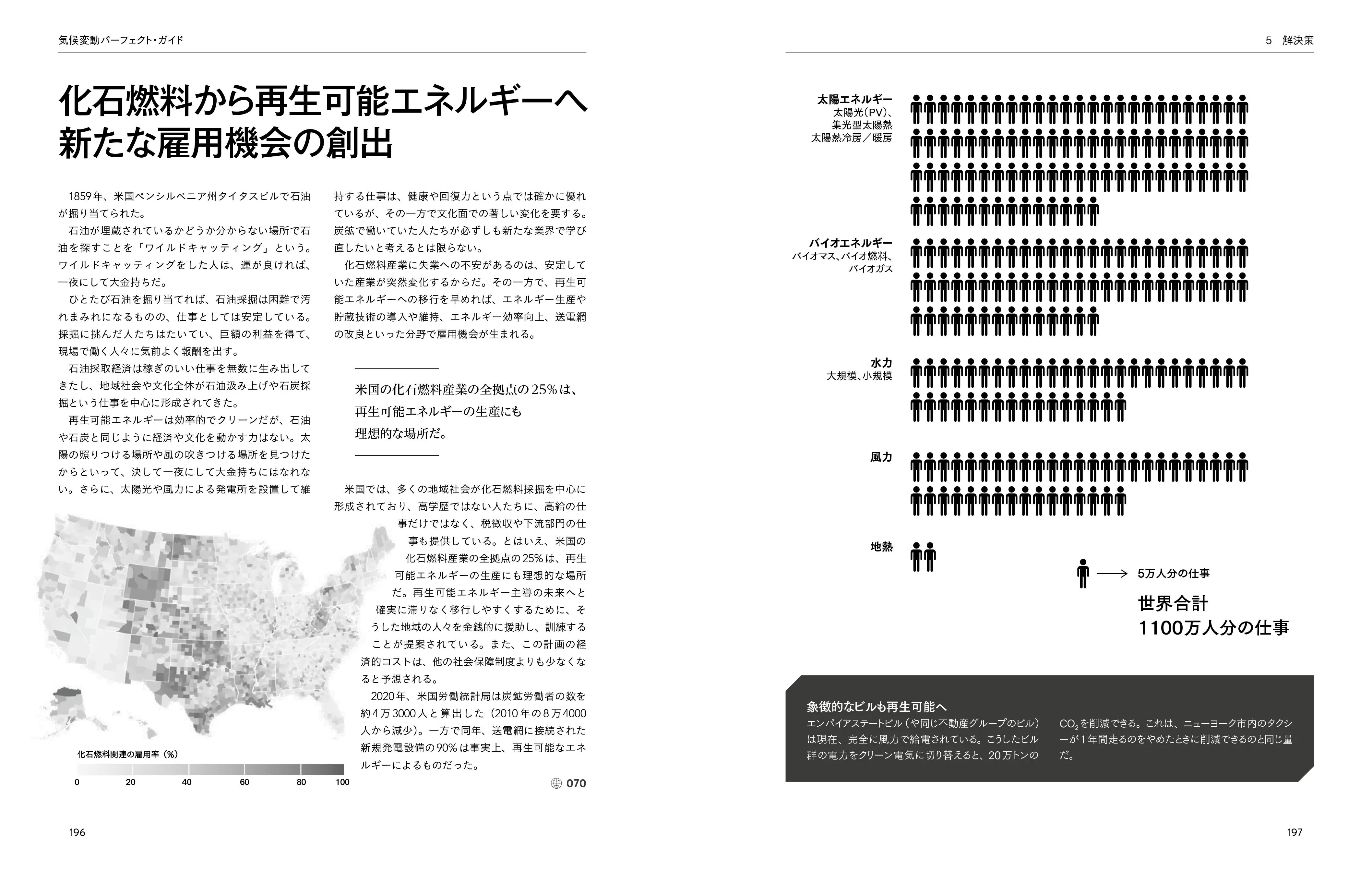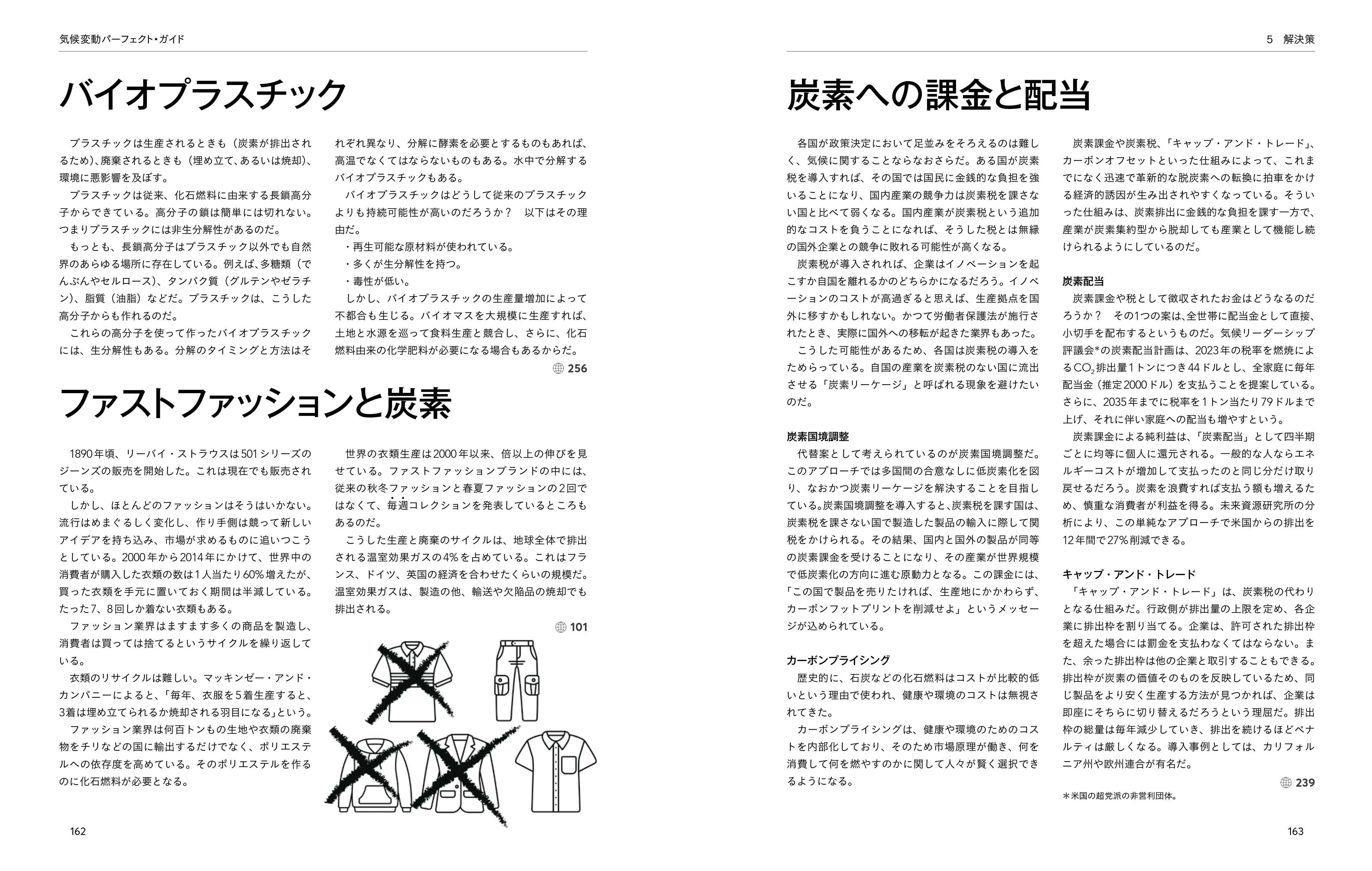 前半は、気候変動の現状と今後起こりうるシナリオを解説(温室効果ガスの4大要因/カーボンロックイン、ネットゼロとは何か/温暖化とCO2排出量の関係/農業と食肉の影響/プラスチックの真のコスト/増え続ける異常気象/拡大する人種不平等と社会不公正/食料価格の高騰/生物多様性の喪失/IPCCが描くシナリオ 他)し、後半はその解決策(再生可能エネルギー/新たな雇用創出/炭素課税と配当/植物性の食生活/森林の再生/自然環境への炭素の貯蔵/ESGデータの利用/ダイベストメント 他)と、気候変動対策に携わる世界のリーダーや企業、個人の取り組みを紹介します。図を多用した短いコラム形式でわかりやすくまとめられ、どこからでも読み始められることも本書の大きな特徴です。