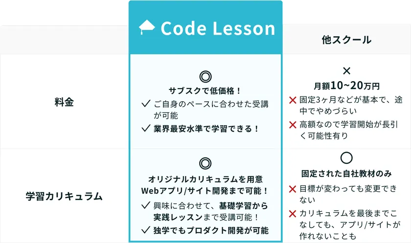 Code Lessonでは、少額のサブスクでご自身のペースでの受講が可能となっています。エンジニアになるまでに必要な学習方法やコーディング課題を網羅しているので、スクールを利用せずに独学でもエンジニア転職に活かせられます!