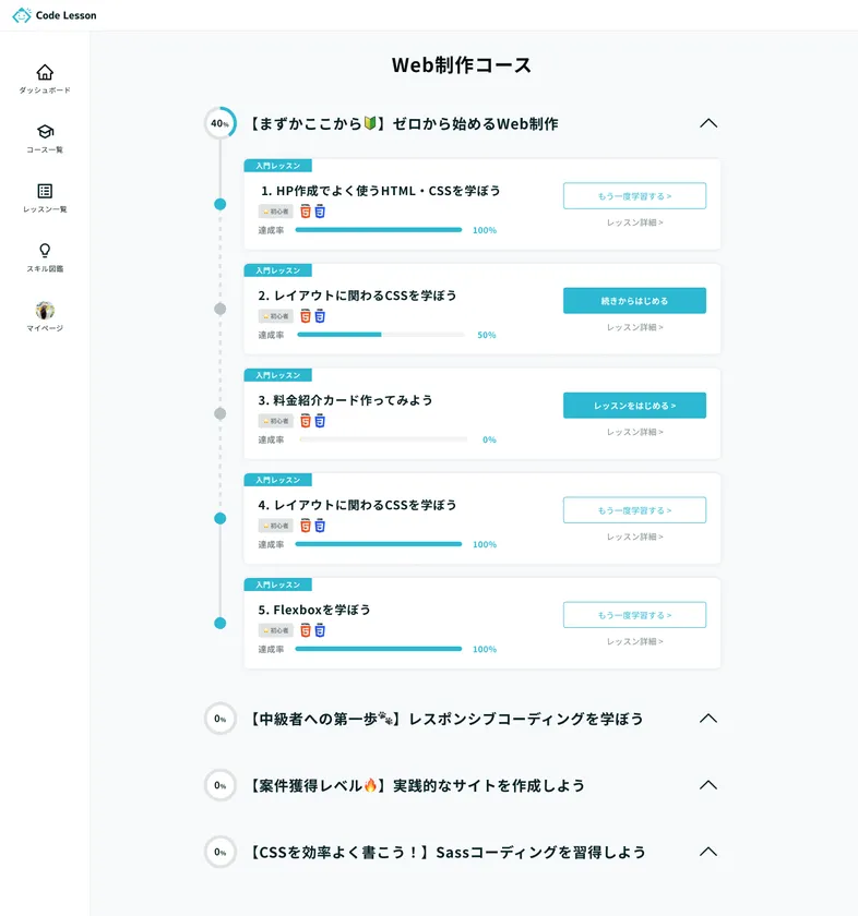 Code Lessonでは、学習ロードマップを引くことで初学者の方が段階を踏んでスキルアップできるよう工夫しています。