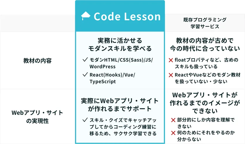 Code Lessonでは、それらの課題を解決するため以下のことに焦点を当てています。