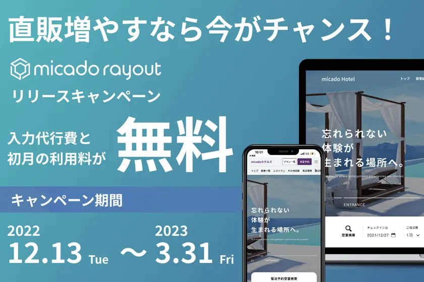 ホテル・旅館のWebサイトに訪問したユーザーの行動データをもとに、最も予約されやすいWebサイトのデザインを創業時から研究し続けていた株式会社micadoが、ホテル・旅館のWebサイトを制作できるホームページ制作ツール「micado rayout」を2022年12月13日(火)に正式にリリースいたしました。( https://micado-rayout.jp/ )