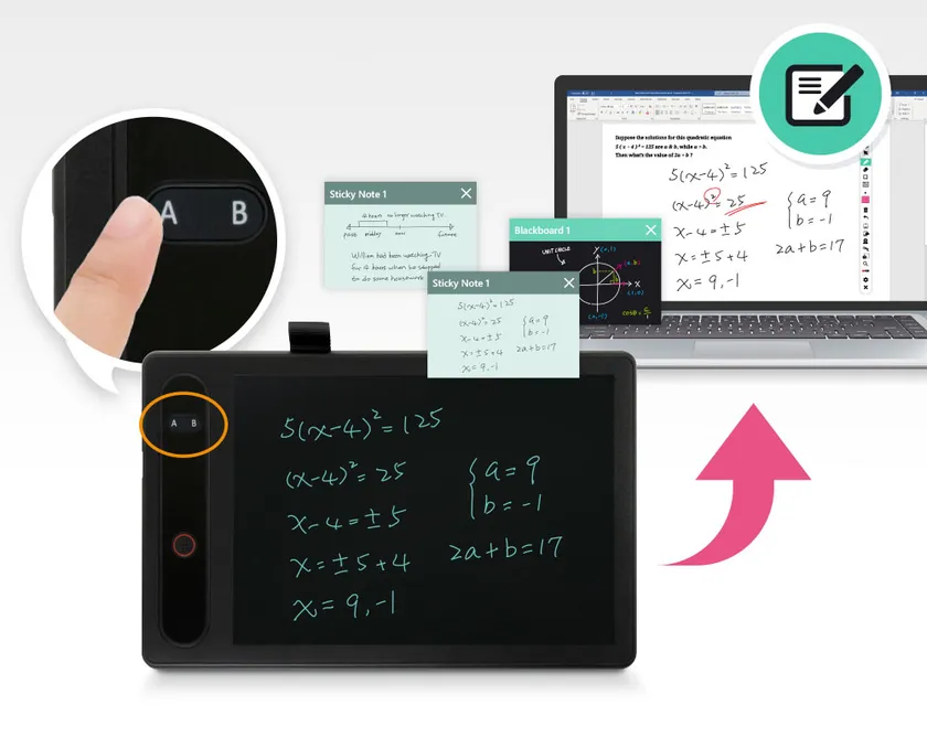 ビデオ付箋機能では書き込みながら解説する過程を録画できるので、動画のマニュアル作りや教材作りも簡単にできます。手書き文字や図表はお使いのドキュメントファイルにドラッグ&ドロップで挿入可能、「描画」機能を使えば直接ドキュメントファイルに手書き文字を残すこともできます。専用ソフトを使用したクラウドホワイトボードでは共有相手と二人同時に書き込むこともできますので、1対1の個別授業やミーティングにも最適です。