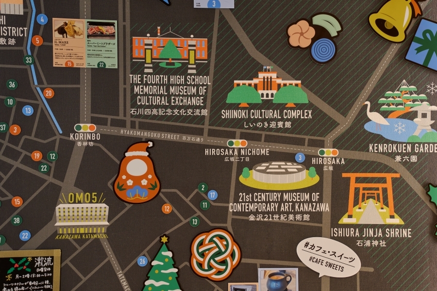 「ご近所マップ」は、1階のパブリックスペース「OMOベース」の一角にある縦横約2mの大きなマップです。当館を中心とした半径約800mを範囲に、スタッフが実際に足を運んで見つけた、おすすめのお店が掲載されています。本イベントの期間中は、全体のデザインもお店の情報も、クリスマスバージョンに変更しちゃいます!サンタをイメージしただるまや、クリスマスカラーの水引のマグネットで飾り付け、期間限定のサービスやメニューの情報はもちろん、金箔を使った料理が楽しめるお店の情報などが満載!お店選びに困ったら、ご近所マップへ集合!目的に合わせて、クリスマスならではの街巡りを楽しめますよ。