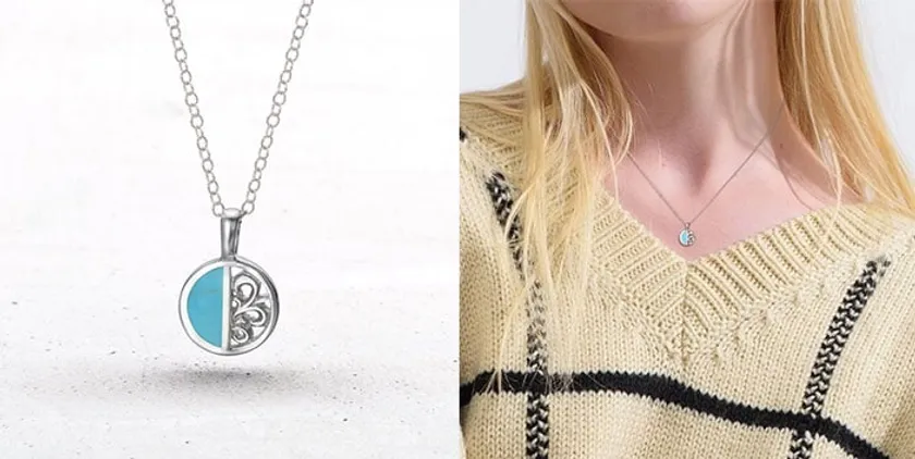コイン型のフレームにアラベスク(唐草)模様と天然石ターコイズをハーフ&ハーフで造形したペンダントトップに細身のチェーンをセットでお届け。