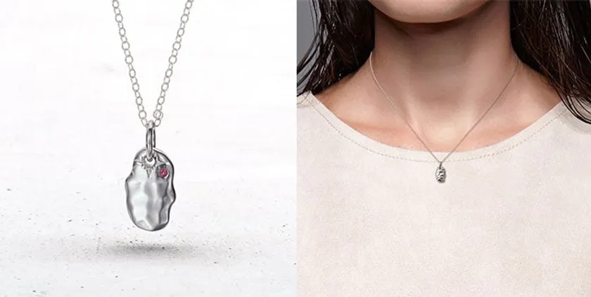 槌目模様が美しいハンマーワーク仕上げのプレートペンダントと、細身のチェーンがセットになった福袋。さりげなくセットされた天然石ルビーがラグジュアリーな仕上がりです。単品使いはもちろん、重ね付けしてもおしゃれです。