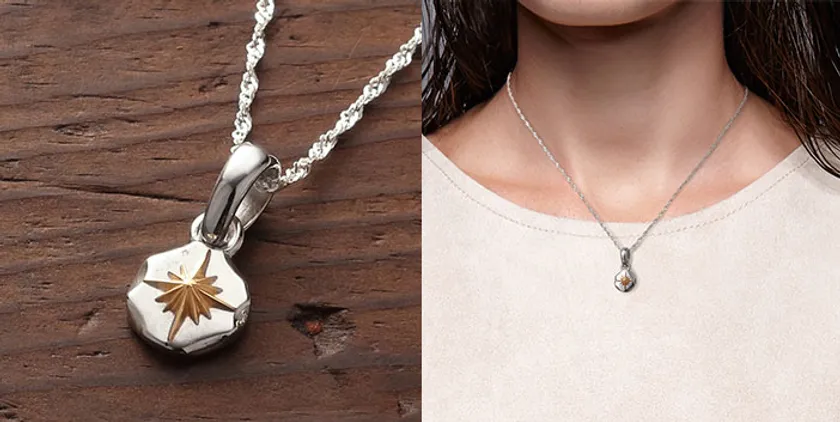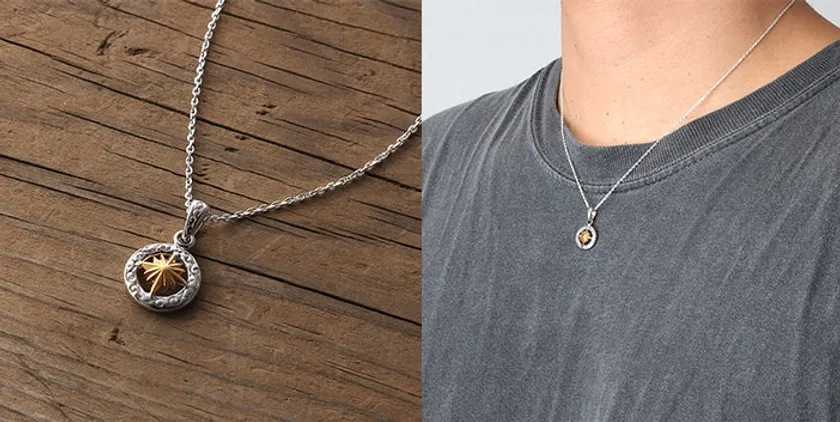 ペンダントトップはK18(純金)コーティング使用のサンシンボル。シルバーフレームを丁寧に研磨することで、上品な輝きとインパクトのある仕上がりに。細身のあずきチェーンのセットにしてお届けします。
