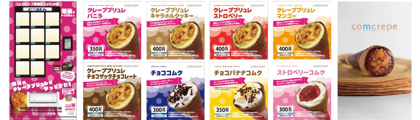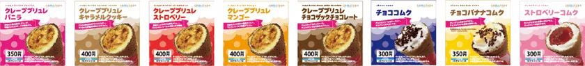 日本初のそして全国で行列を作る、焦がしクレープである「クレープブリュレシリーズ」から5種類、コムクレープオリジナル製法のココア味の生地で作った「コムクシリーズ」から3種類の全8種類をラインナップ。店舗と比べて値段もサイズも求めやすいものを開発。
