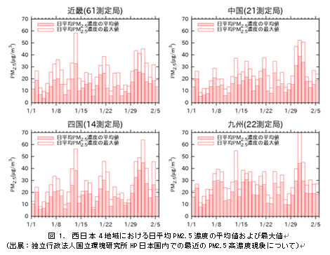 図1. 西日本4地域における日平均PM2.5濃度の平均値および最大値
