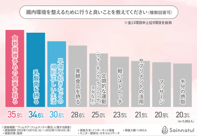 「腸内環境を整えるために行うと良いことを教えてください(複数回答可)」と質問したところ、『食物繊維多めの食事を取る(35.9%)』と回答した方が最も多く、次いで『乳酸菌を摂る(34.6%)』『早寝早起きなどの規則正しい生活(30.6%)』と続きました。