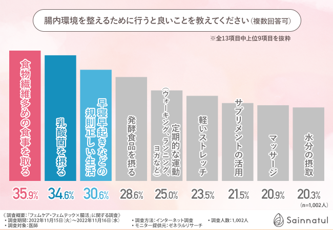 そこで今回、3冠受賞の腸活・乳酸菌サプリ『CHONY(チョー二イ)』(https://sainnatul.jp/shopping/lp.php?p=chony)を販売するANCHORパートナー株式会社Sainnatul(サインナチュル)事業部は、医師を対象に、「フェムケア・フェムテック×腸活」に関する調査を実施しました。