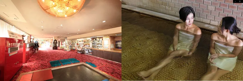 「竜王ラドン温泉 湯ーとぴあ」フロント(左)と、純温泉A認定のかけ流しの温泉